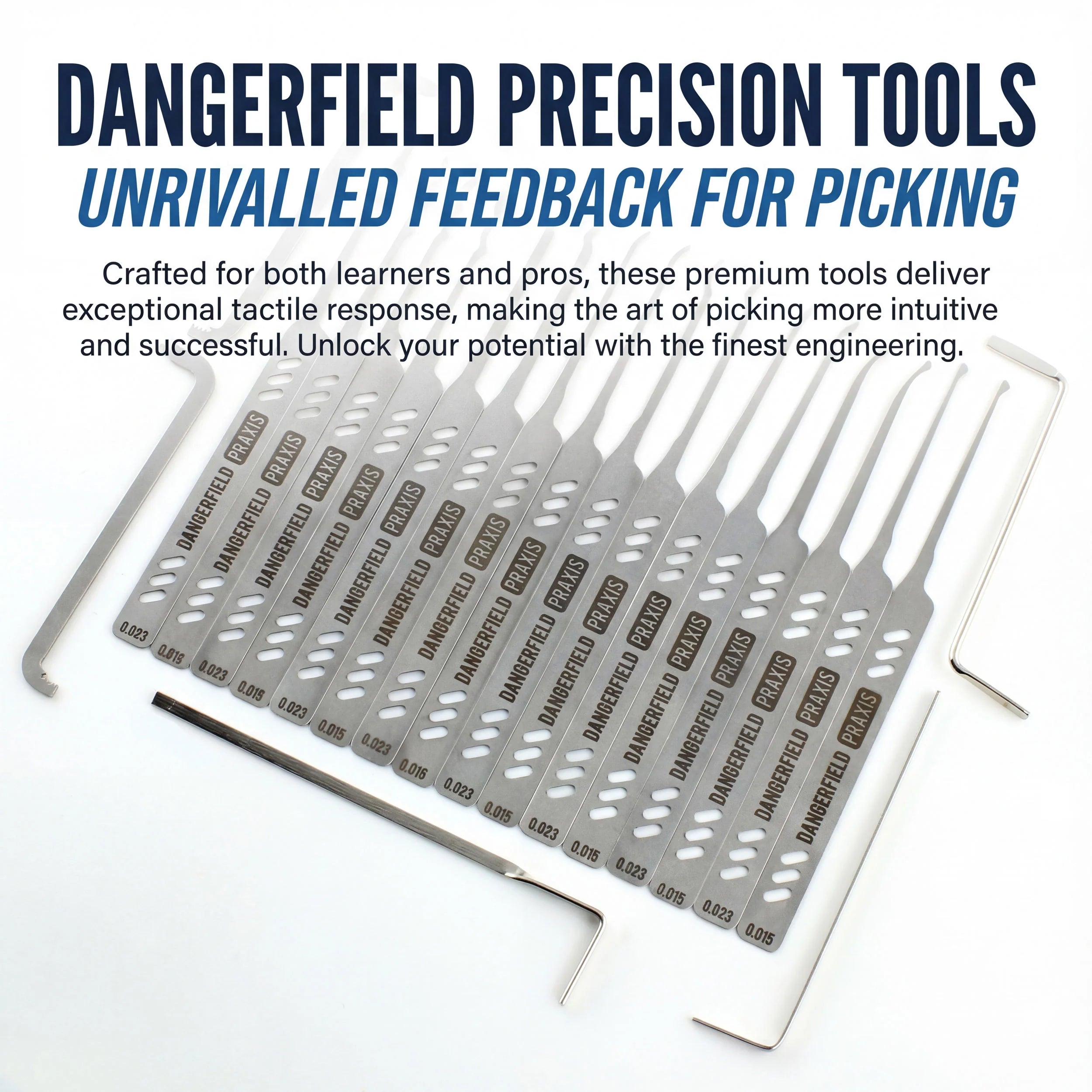 The Dangerfield Praxis Locksmith Tool Kit is a professional lock picking set intended for mechanical lock work, skills development, and controlled physical security assessment.
